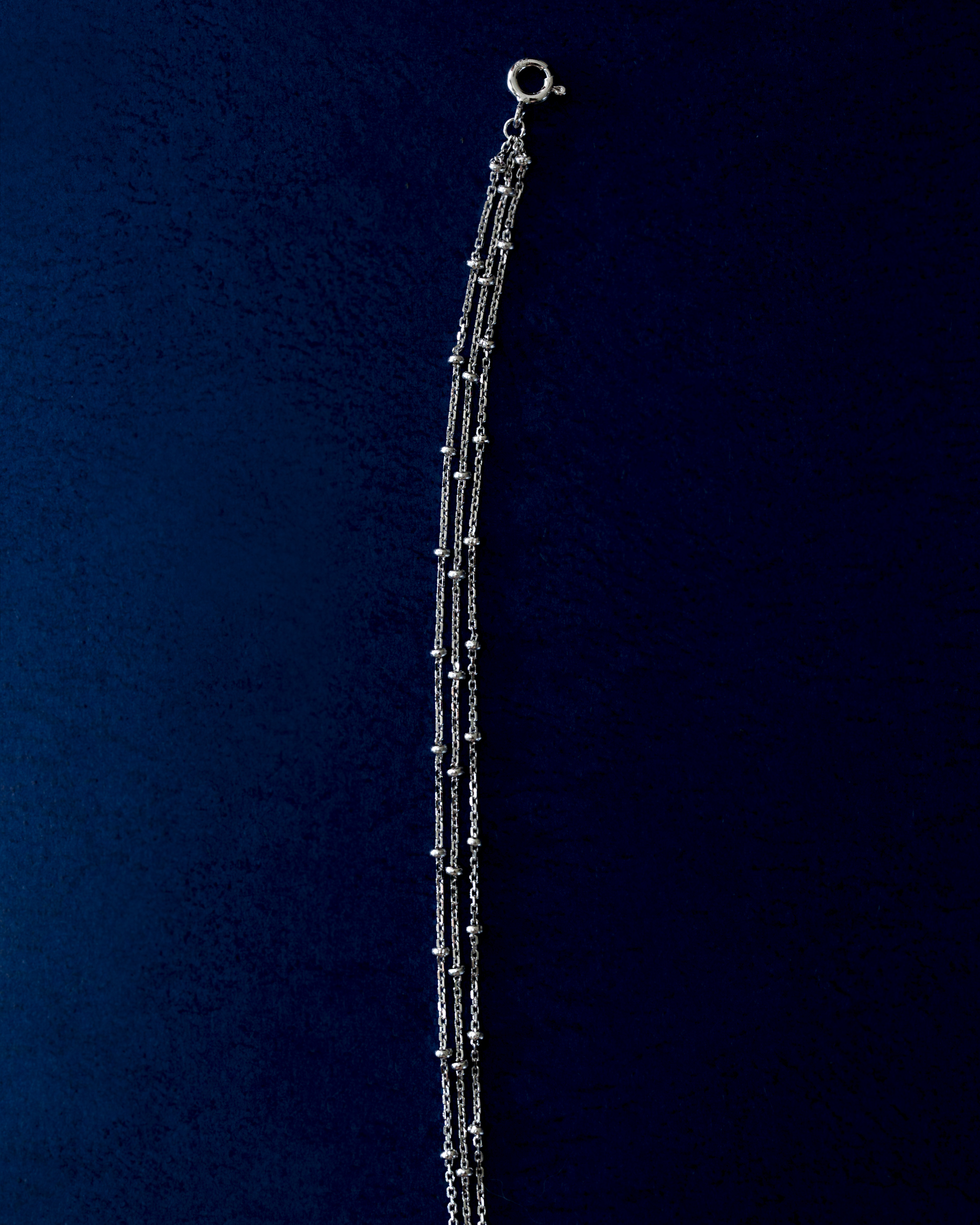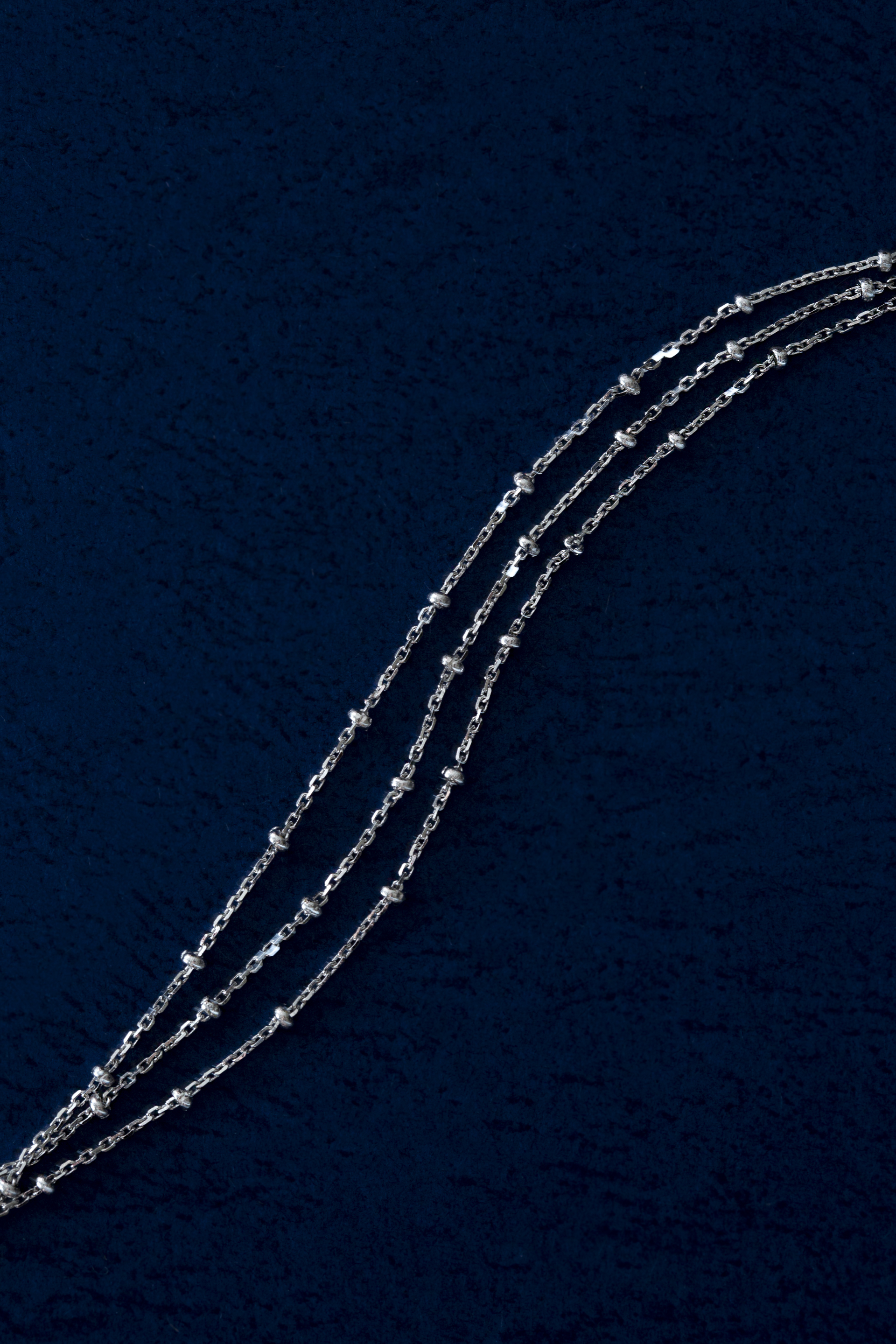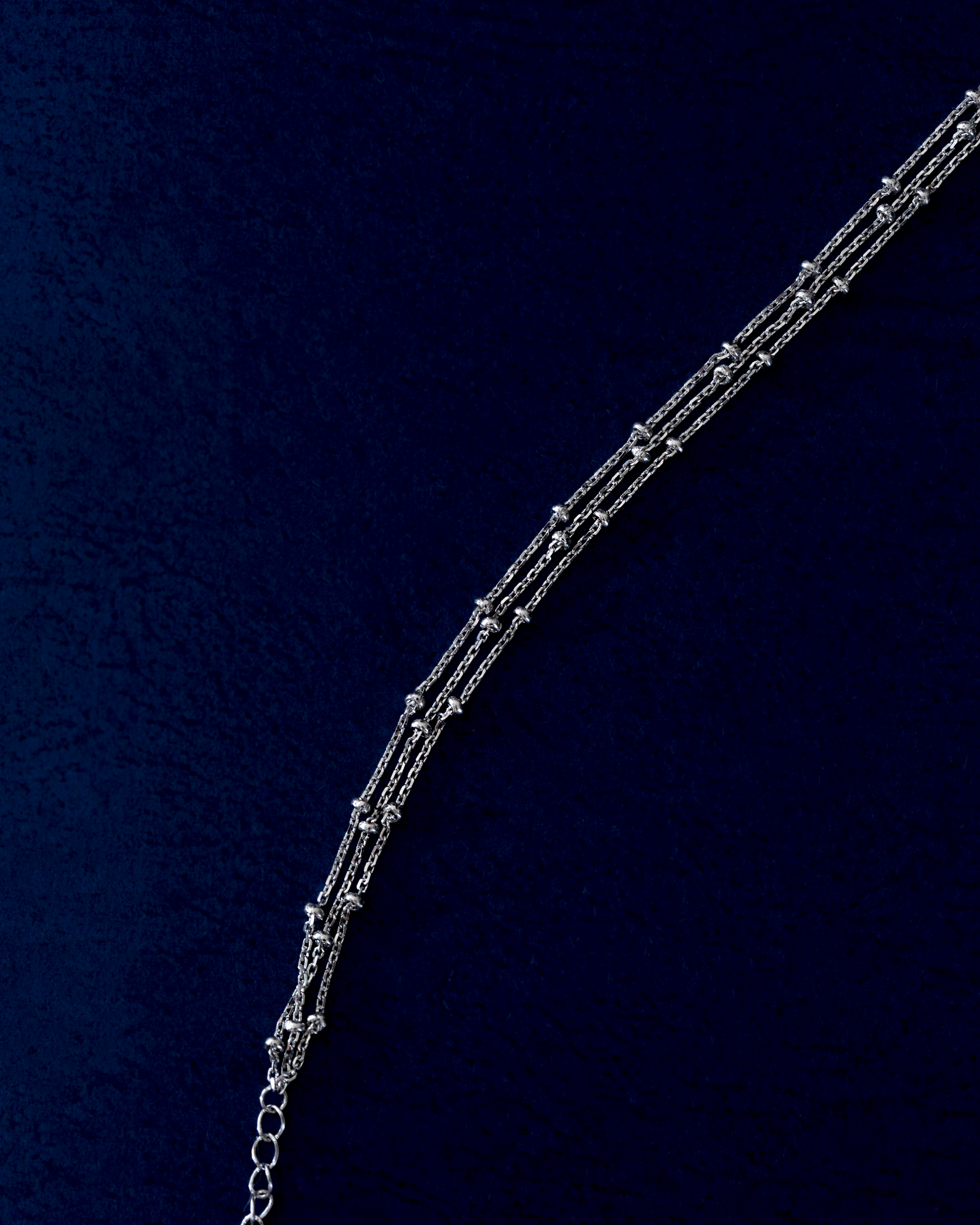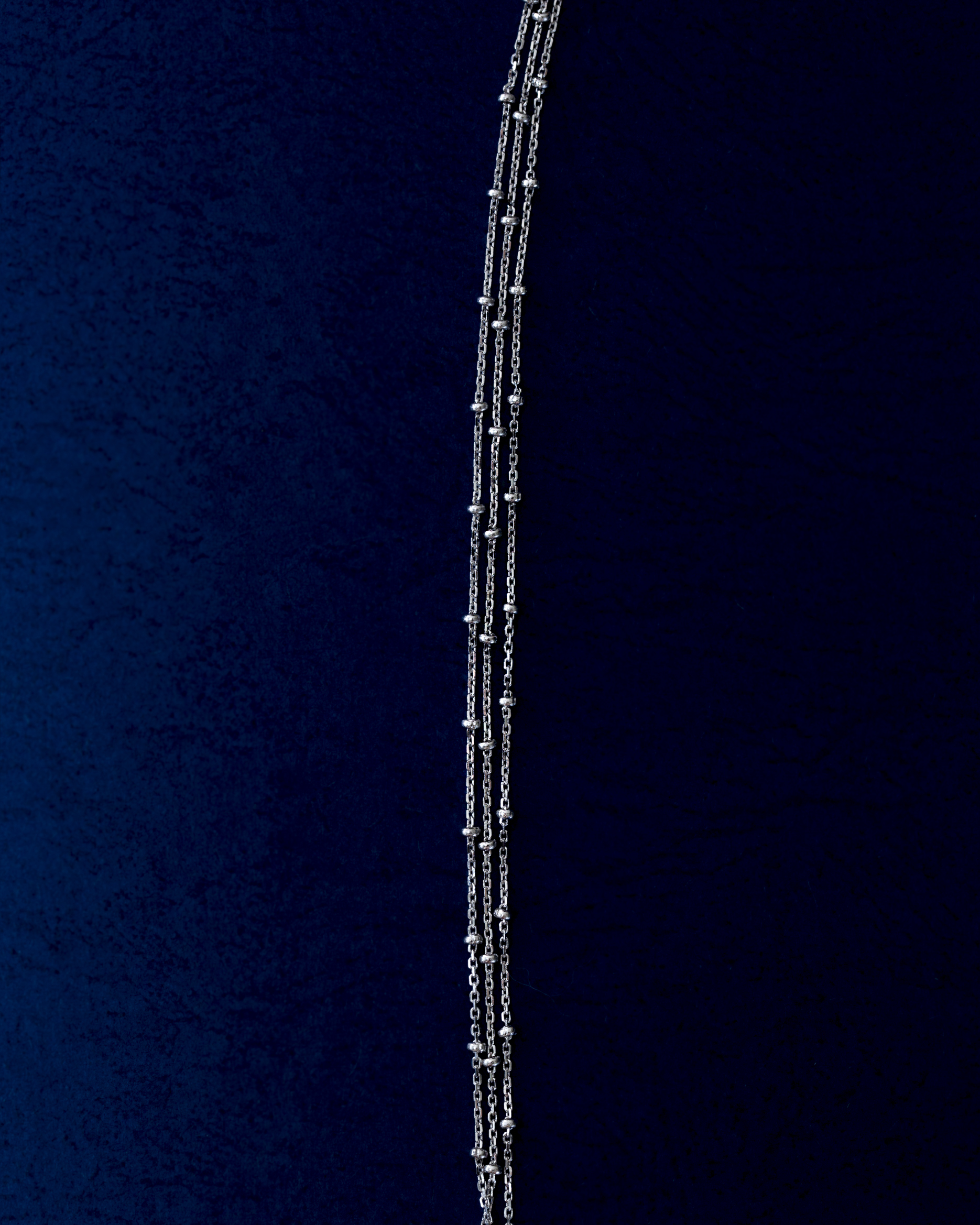 以三條細緻鍊身打造輕盈自然線條,畫龍點睛的小圓銀珠穿插其中,