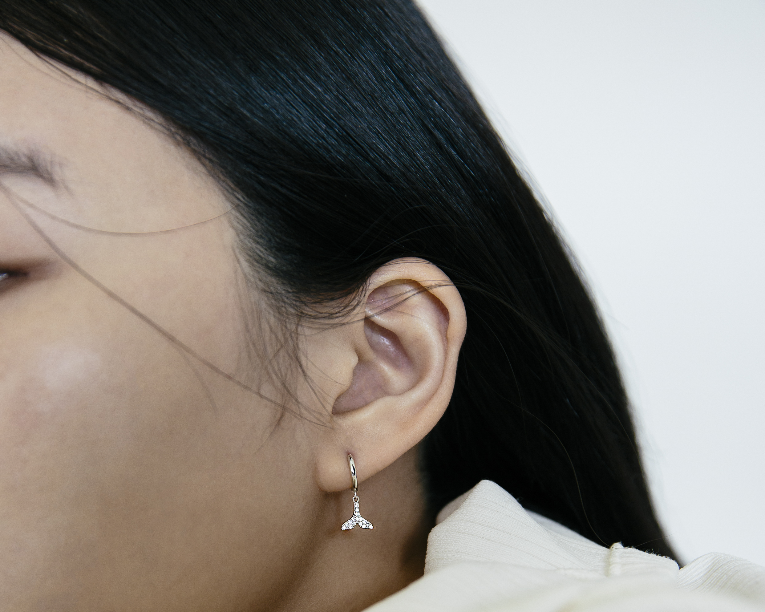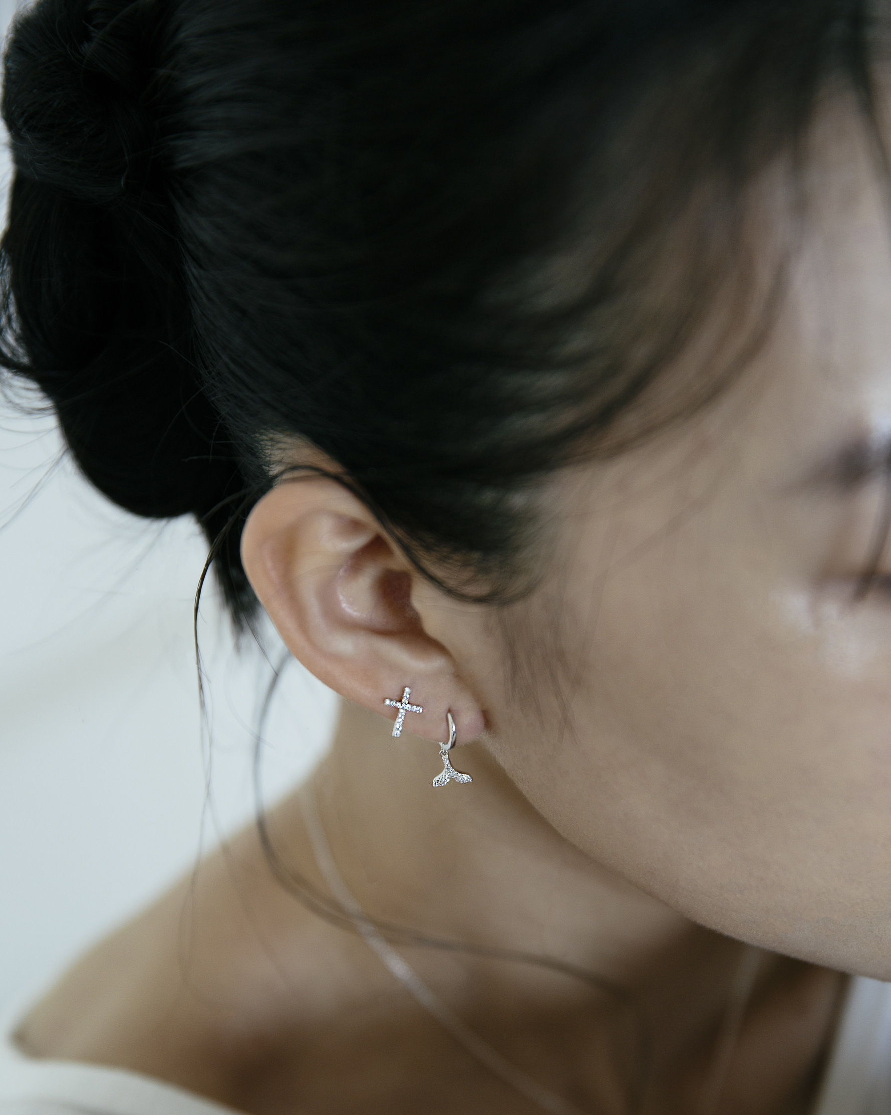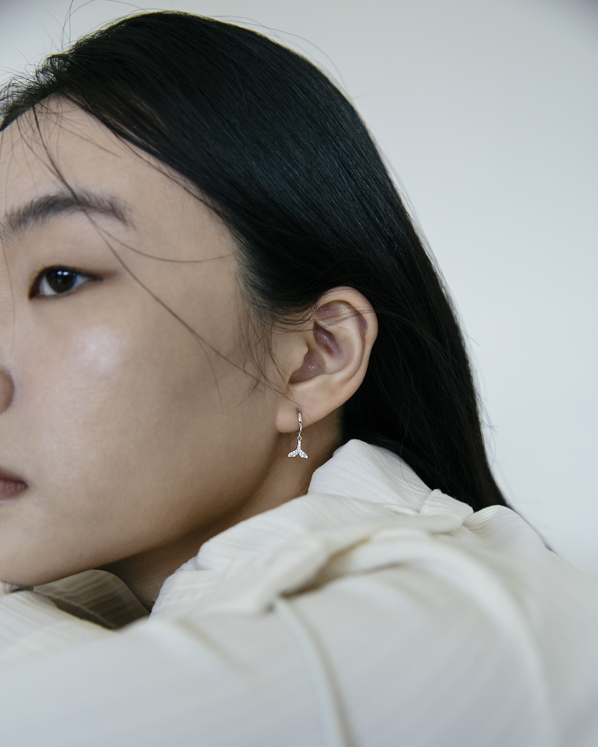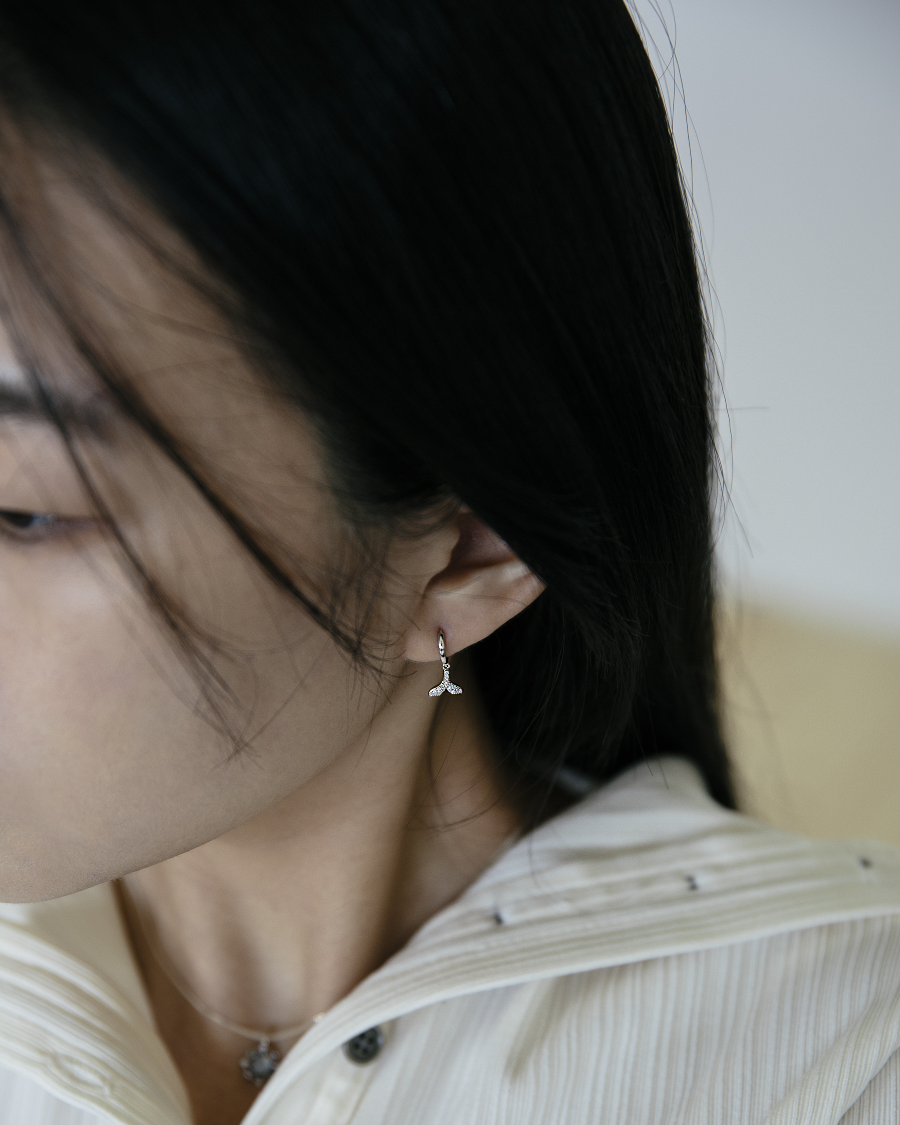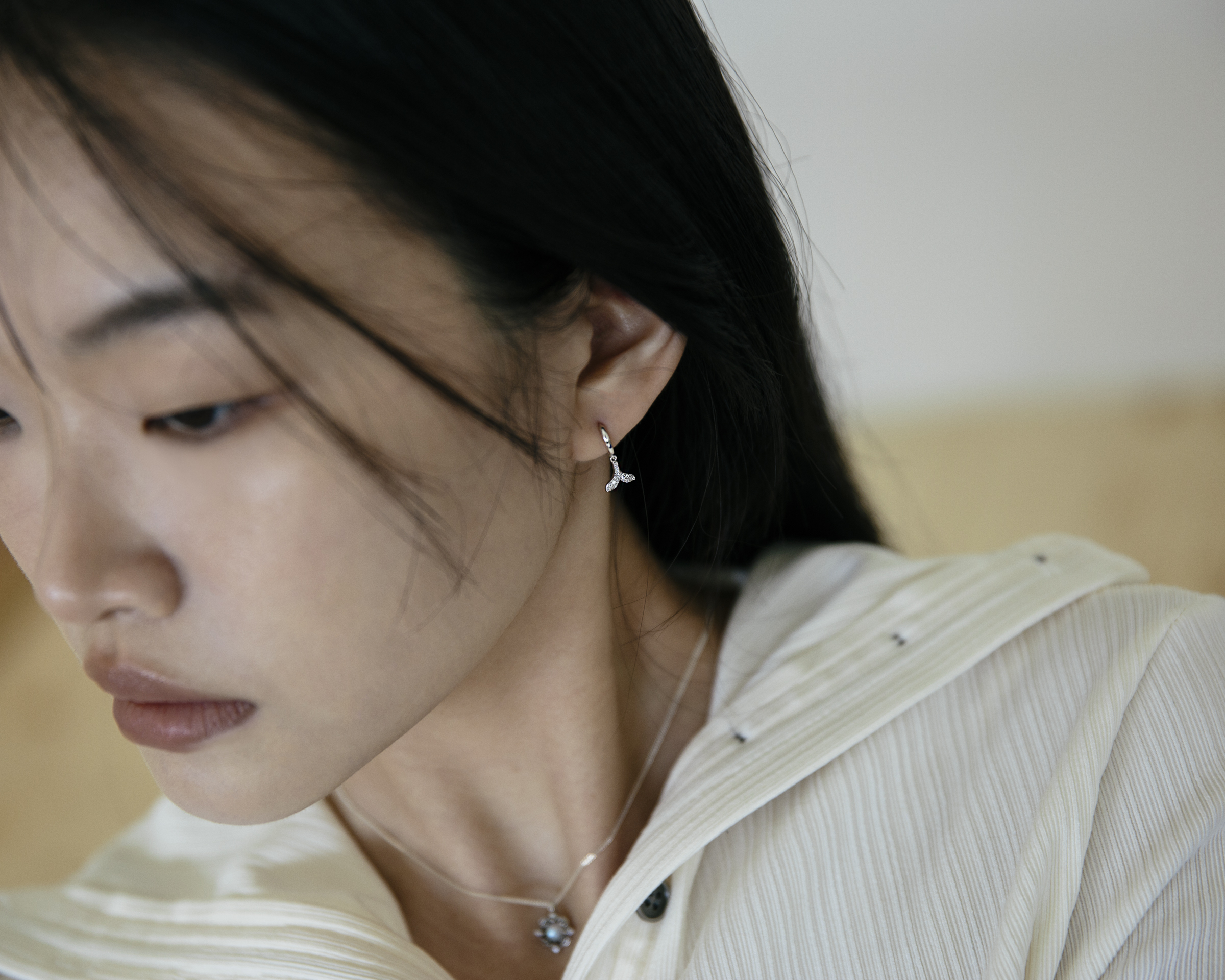 以小巧圈式耳環搭配細緻魚尾造型吊墜,線條簡潔俐落,在耳畔延伸出微微的流動感。
