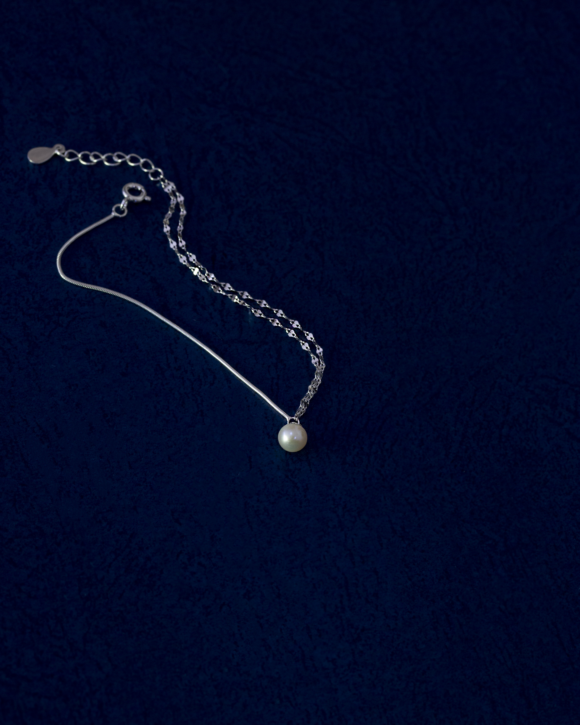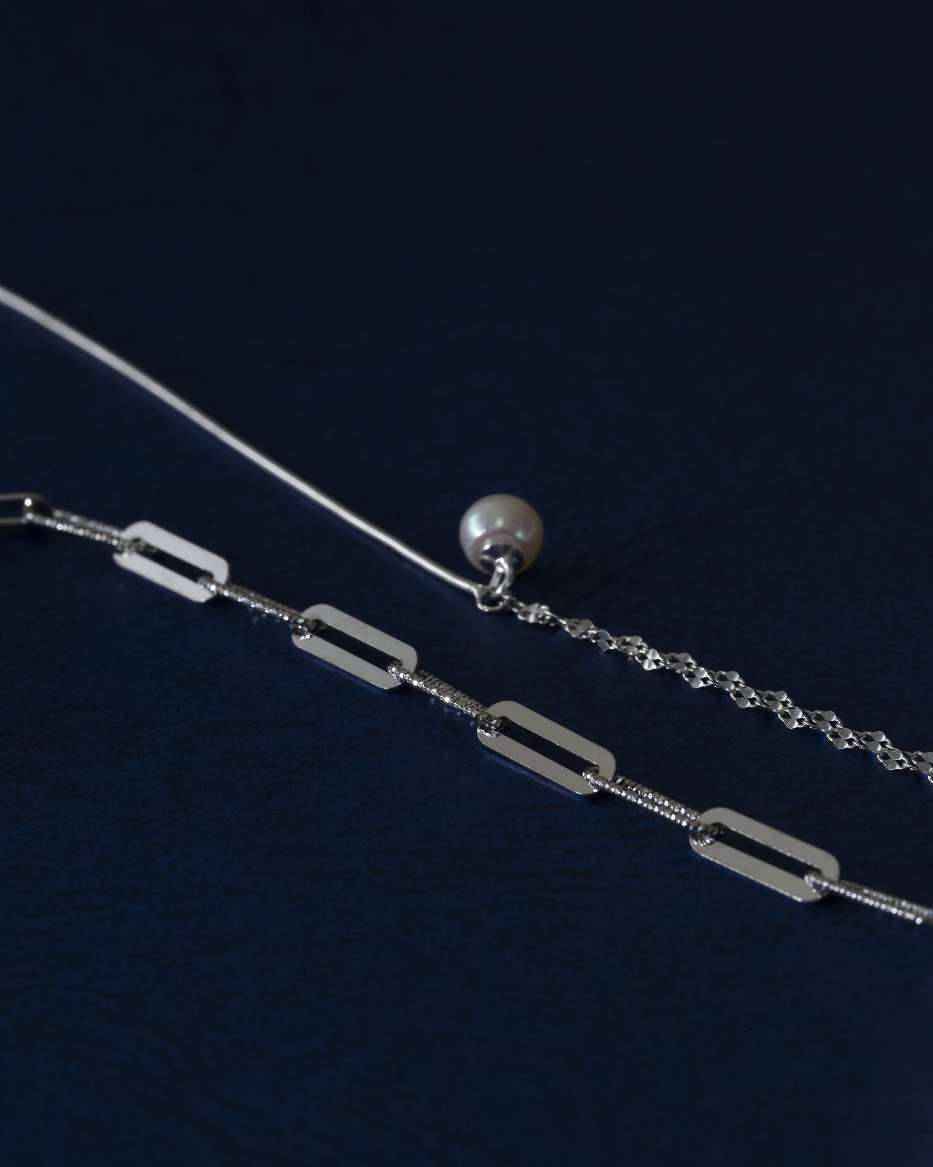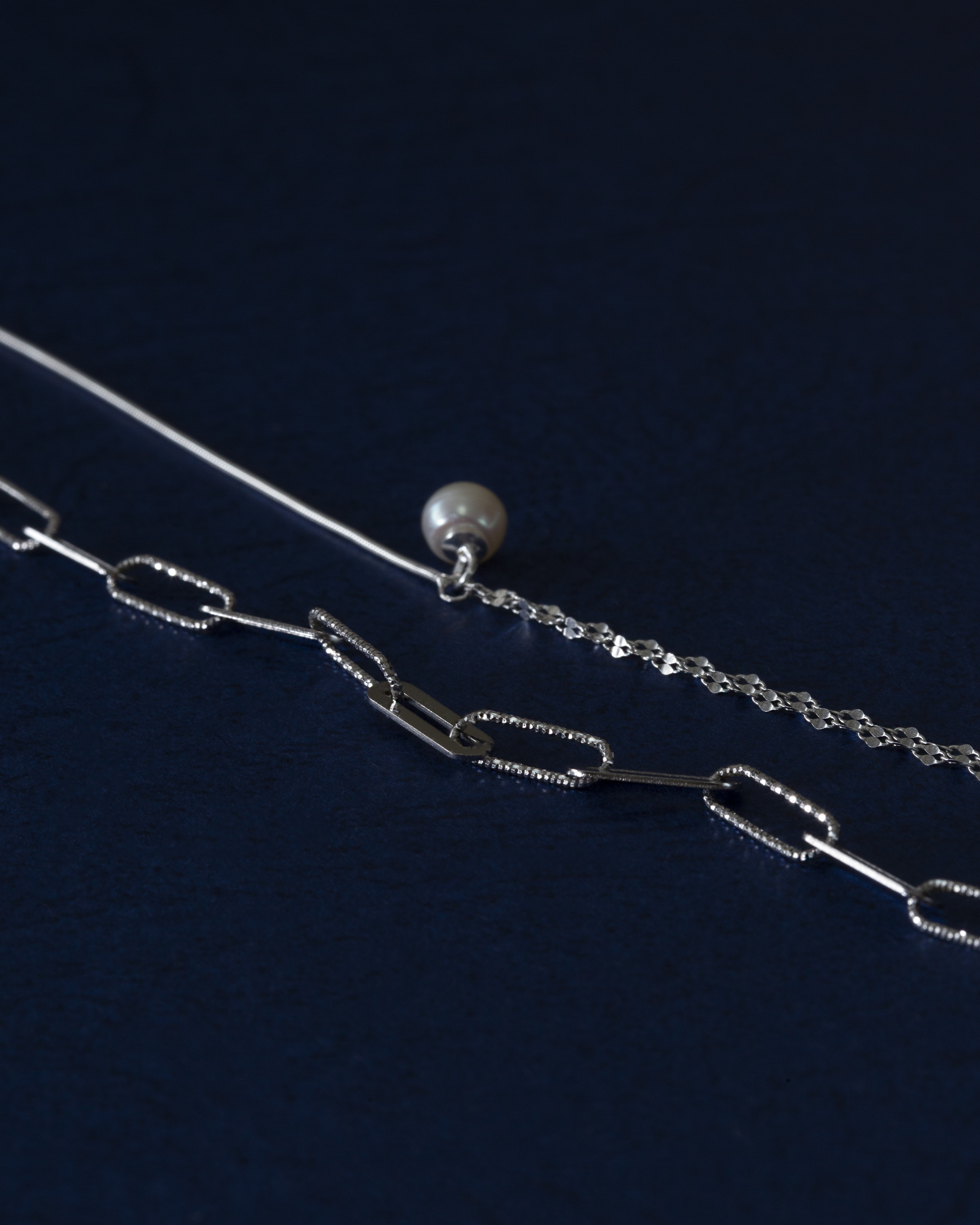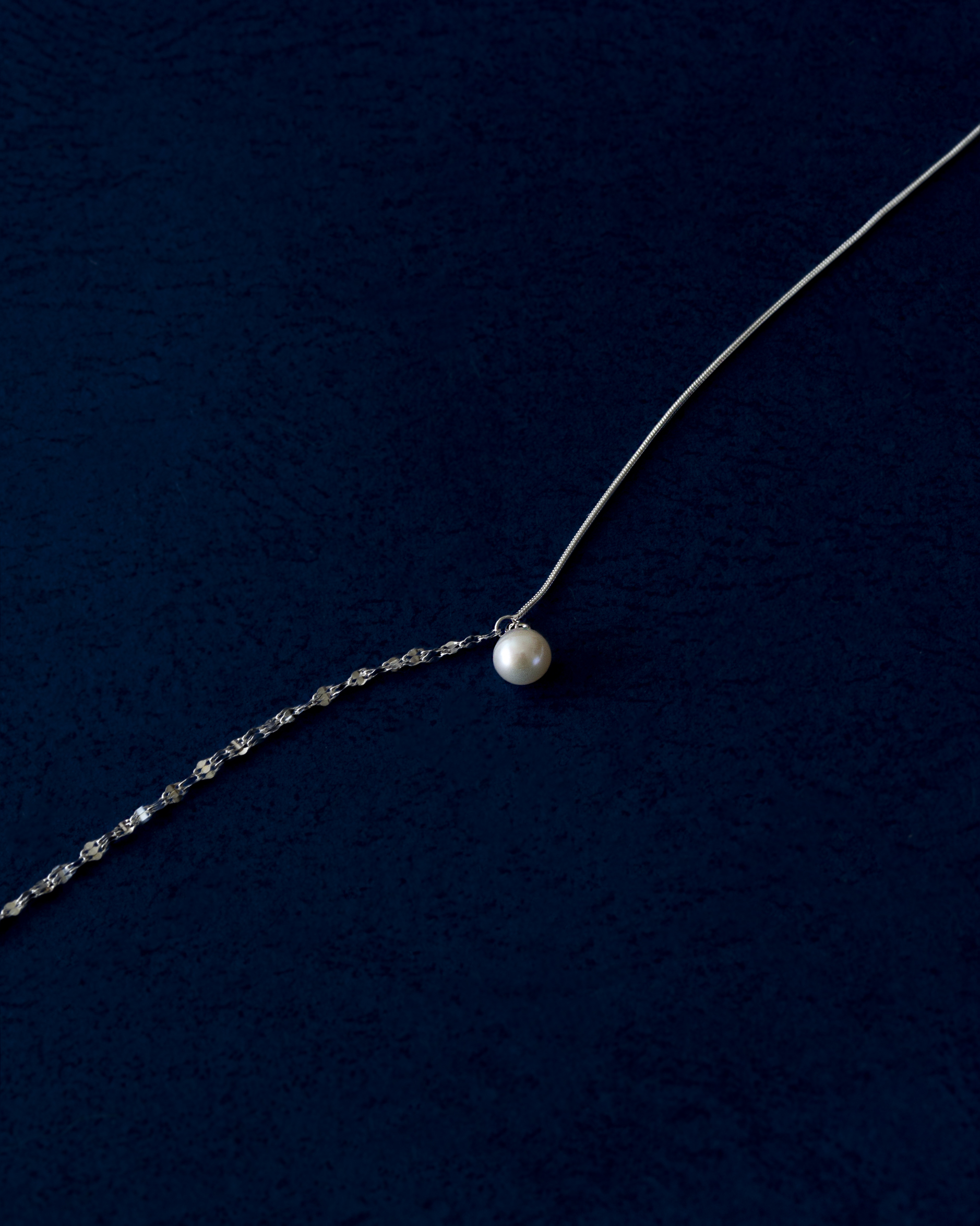 以珍珠作為連結點,一側為順滑蛇鍊,一側為細緻碎閃鍊,兩種魅力在此相遇。