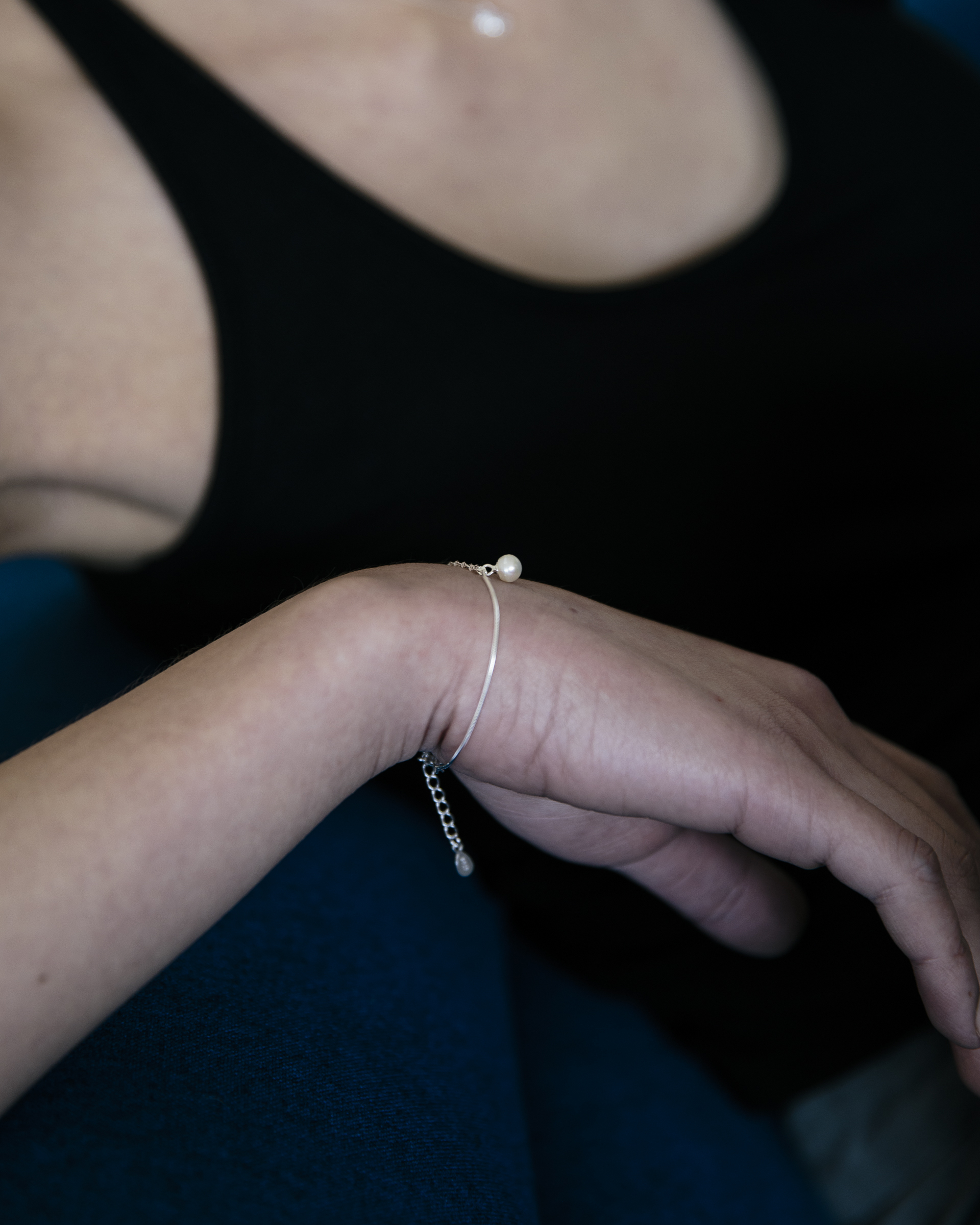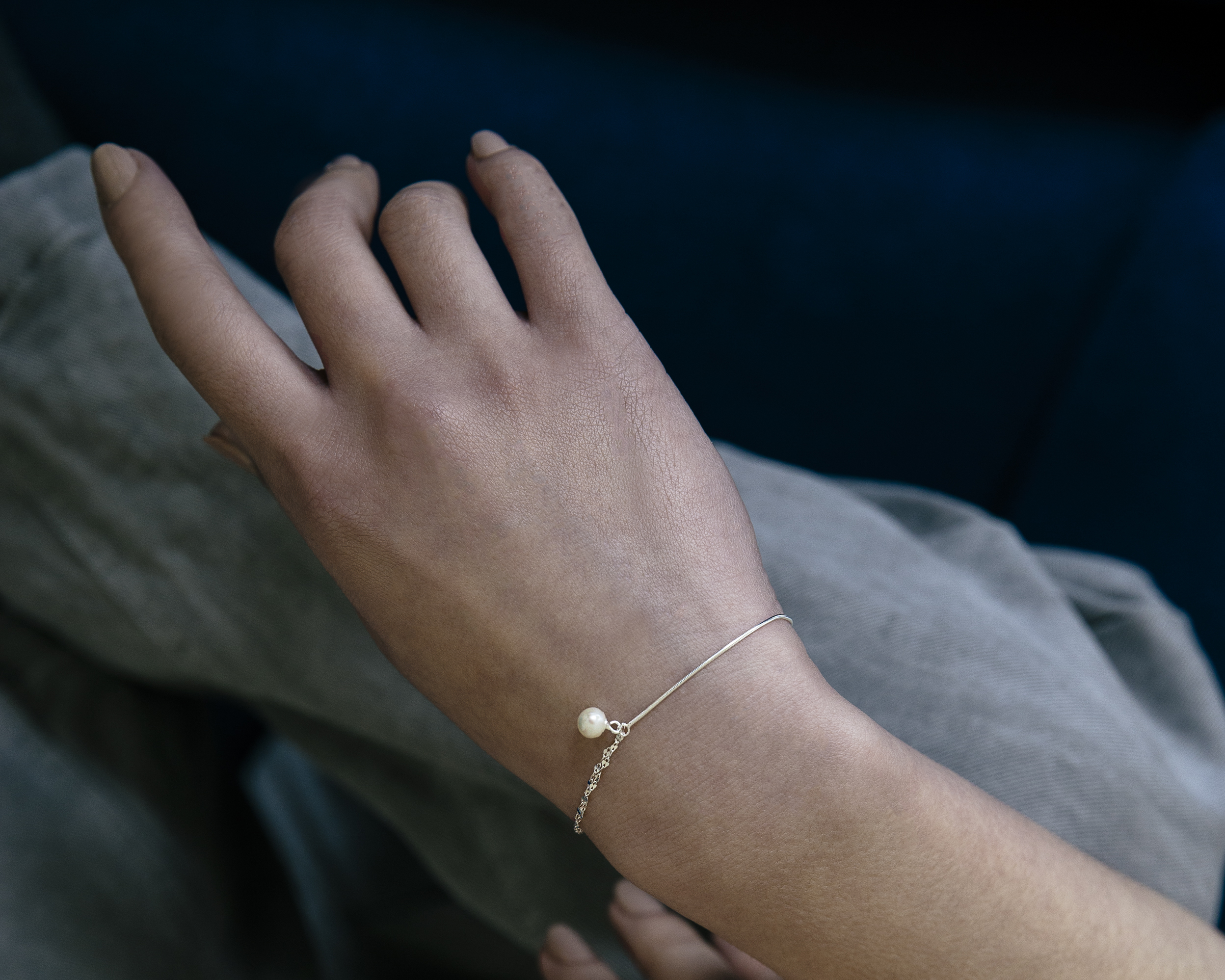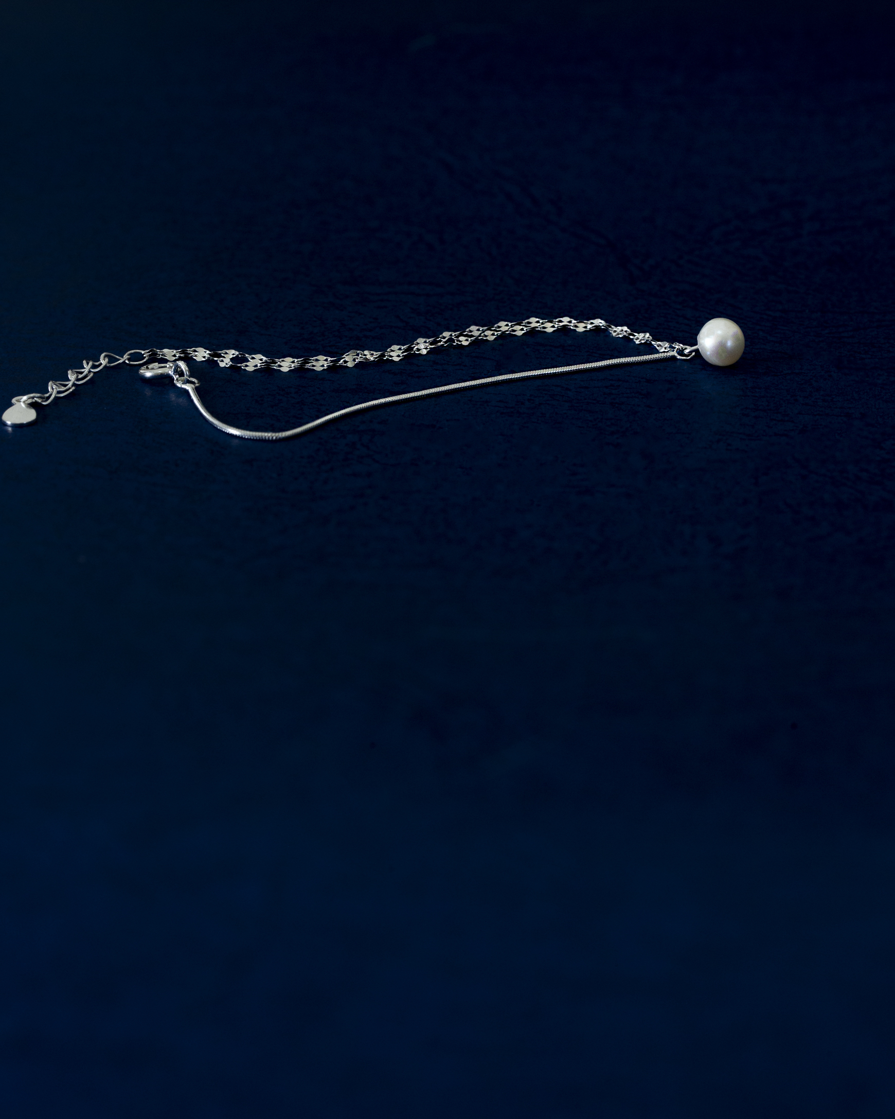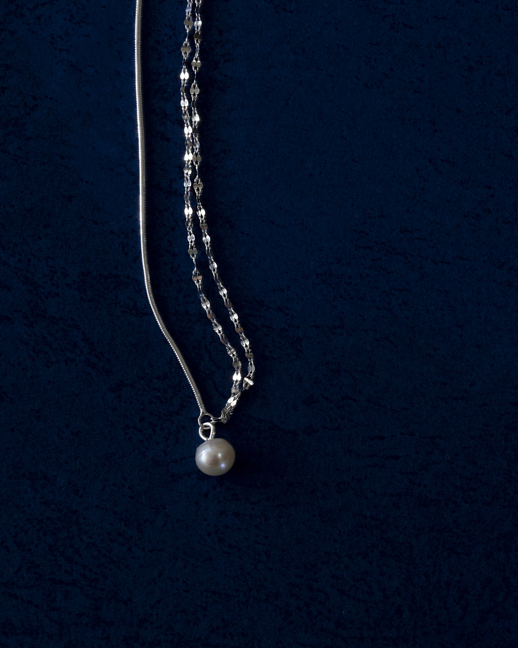 以珍珠作為連結點,一側為順滑蛇鍊,一側為細緻碎閃鍊,兩種魅力在此相遇。
