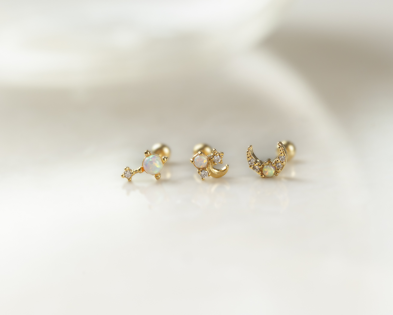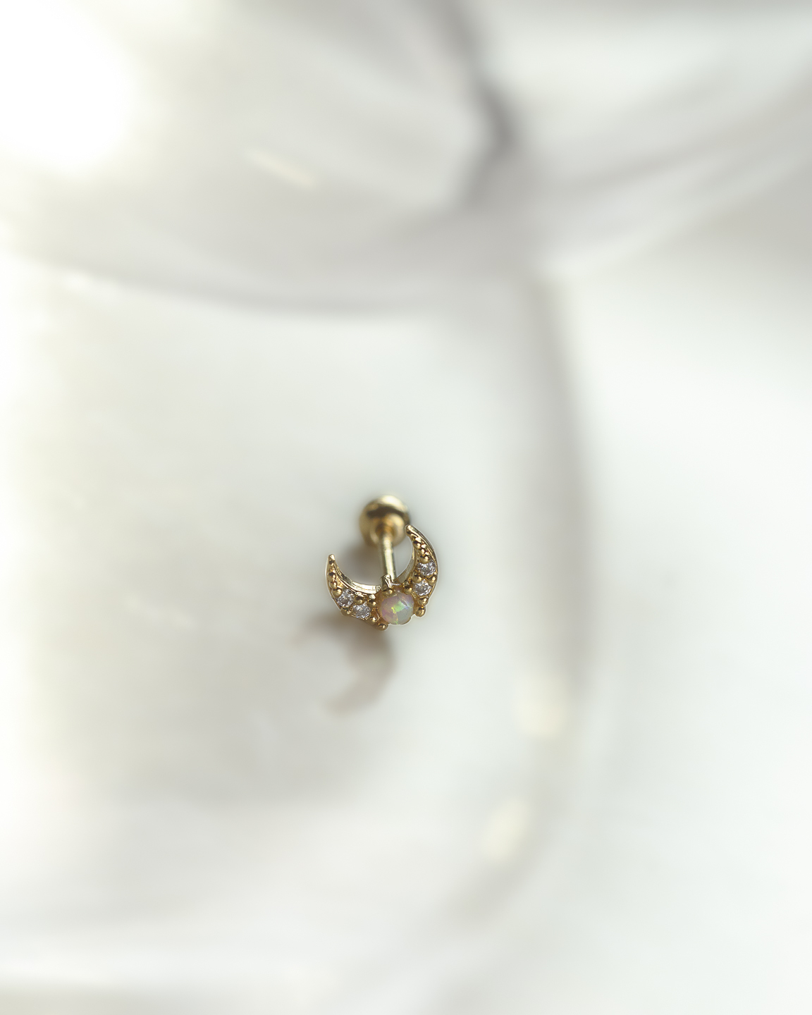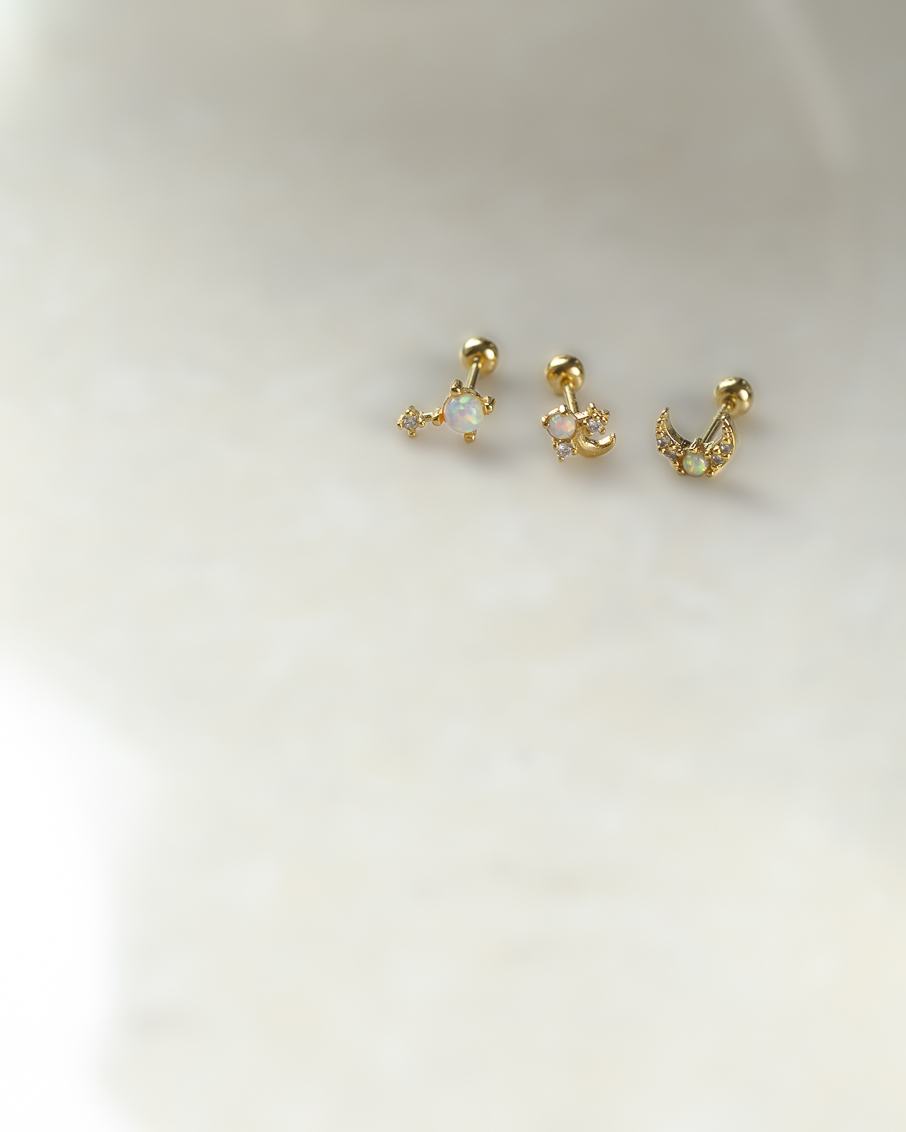 新月造型鑲上蛋白石與鋯石,閃爍與柔光交錯,像夜空中的一抹閃動。