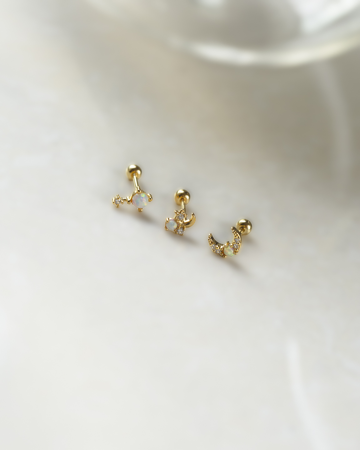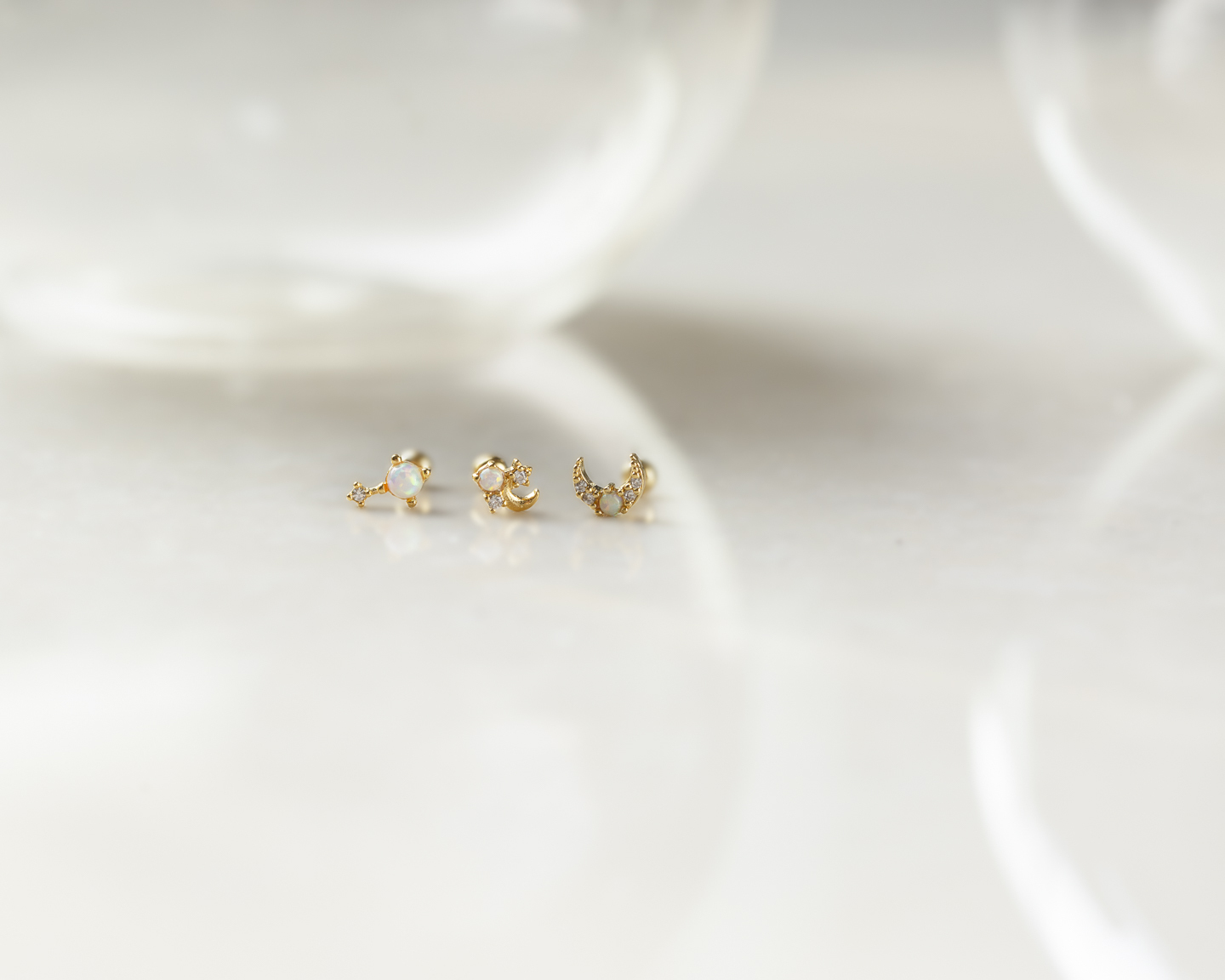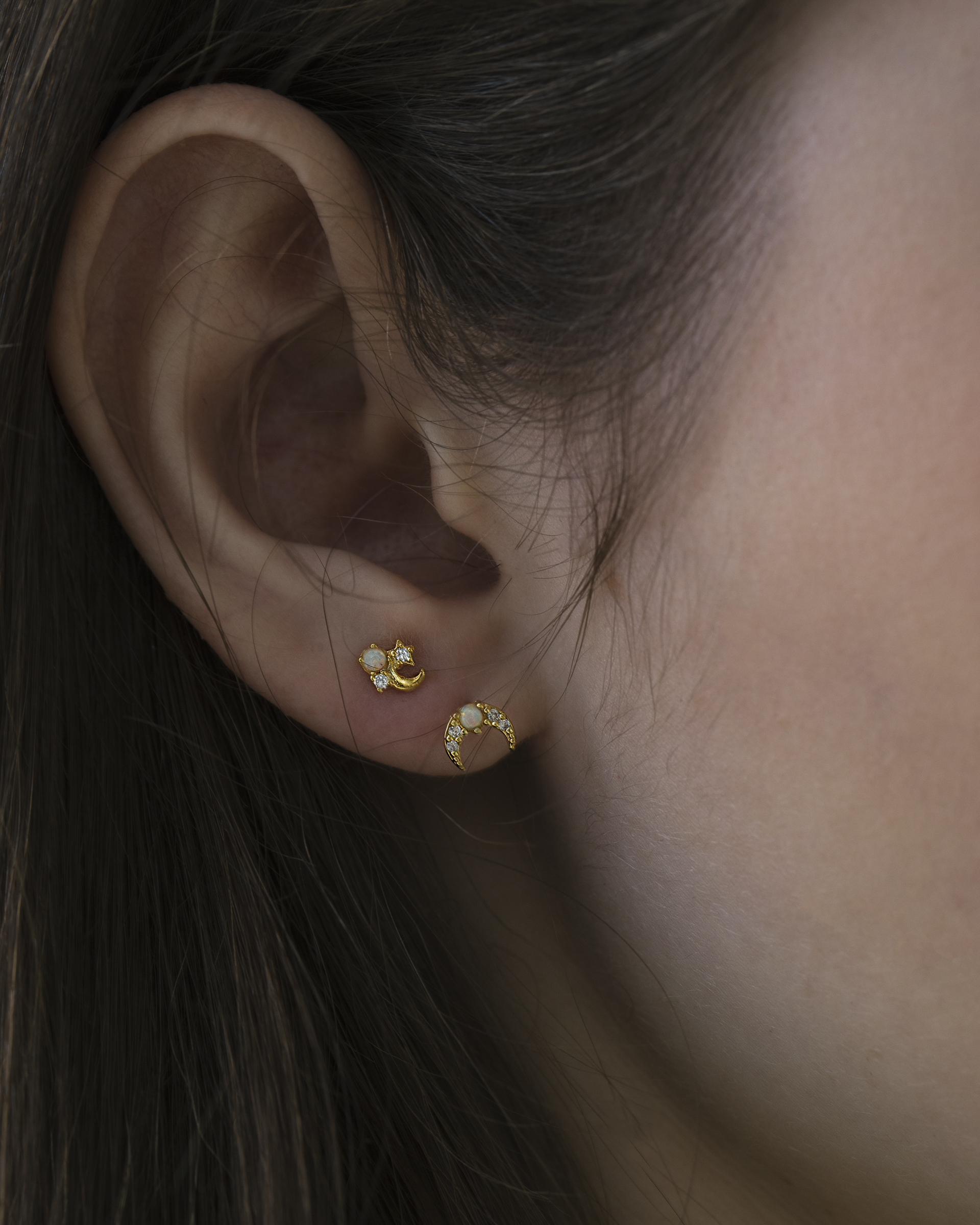 新月造型鑲上蛋白石與鋯石,閃爍與柔光交錯,像夜空中的一抹閃動。
