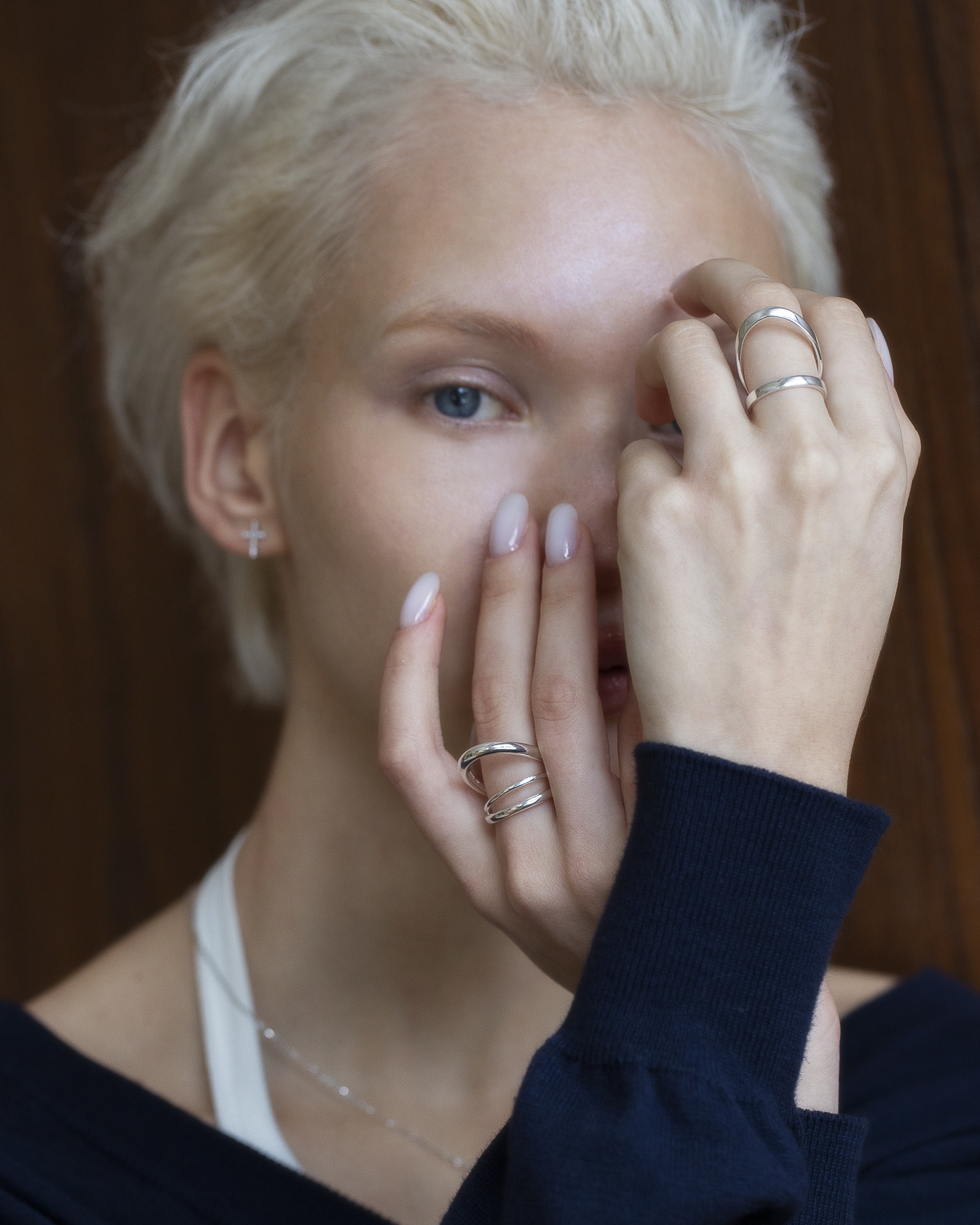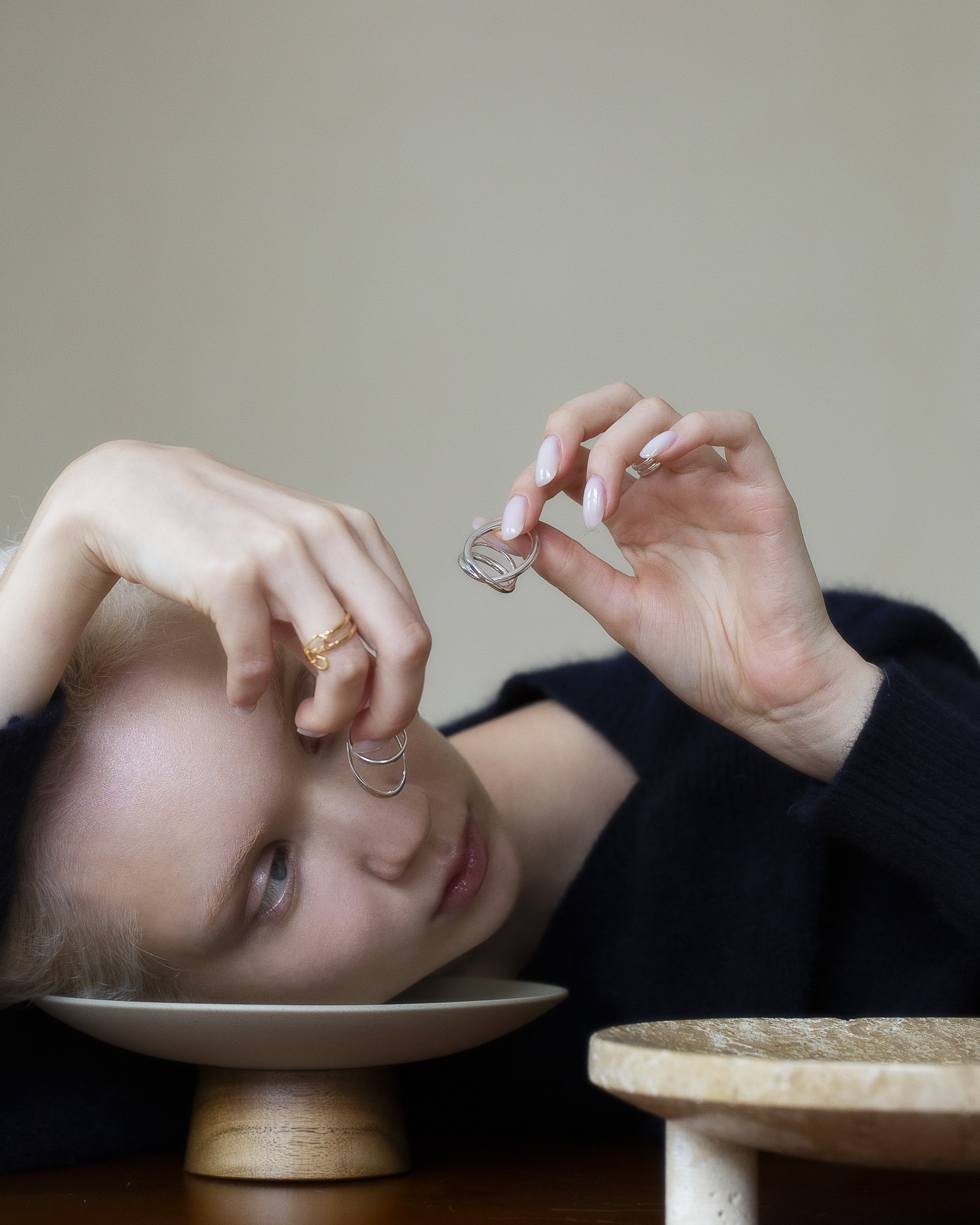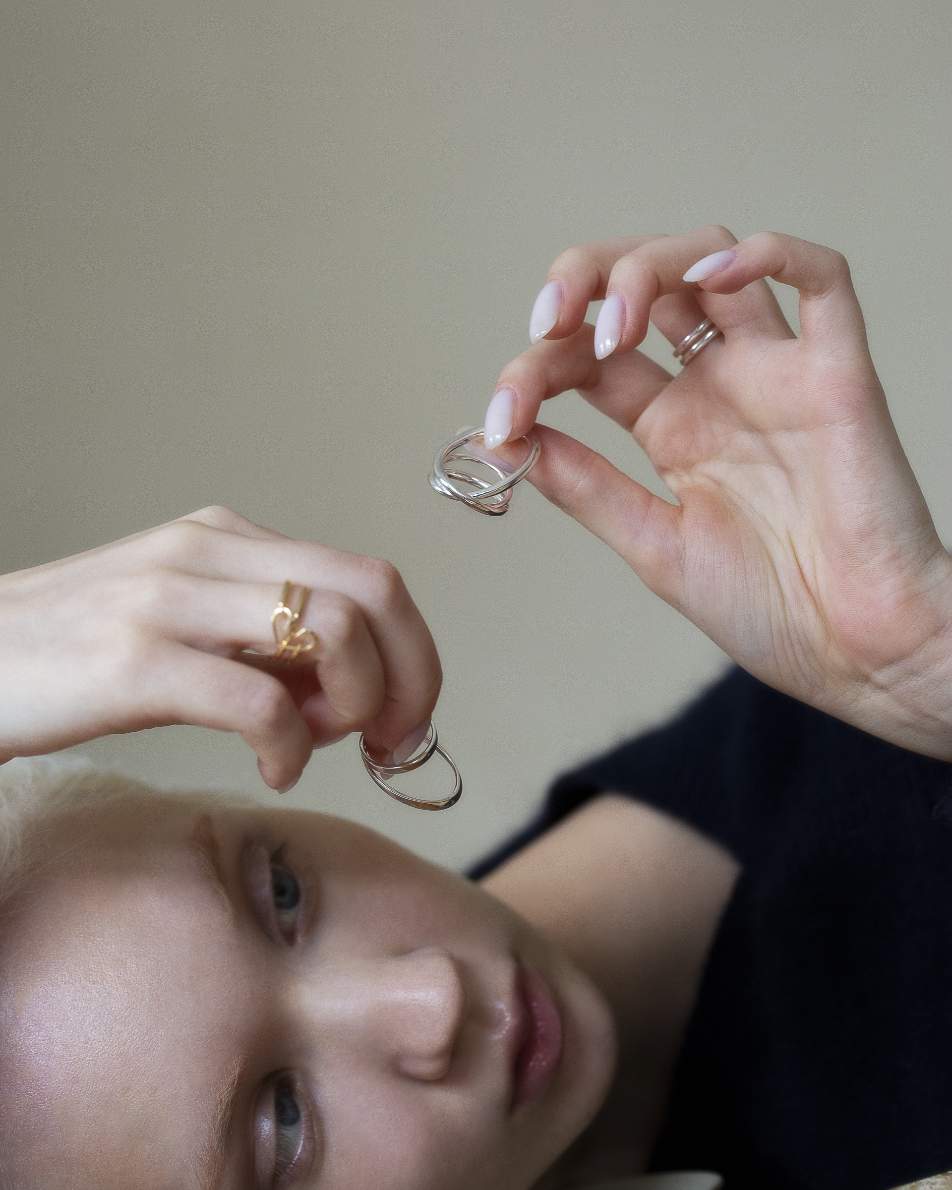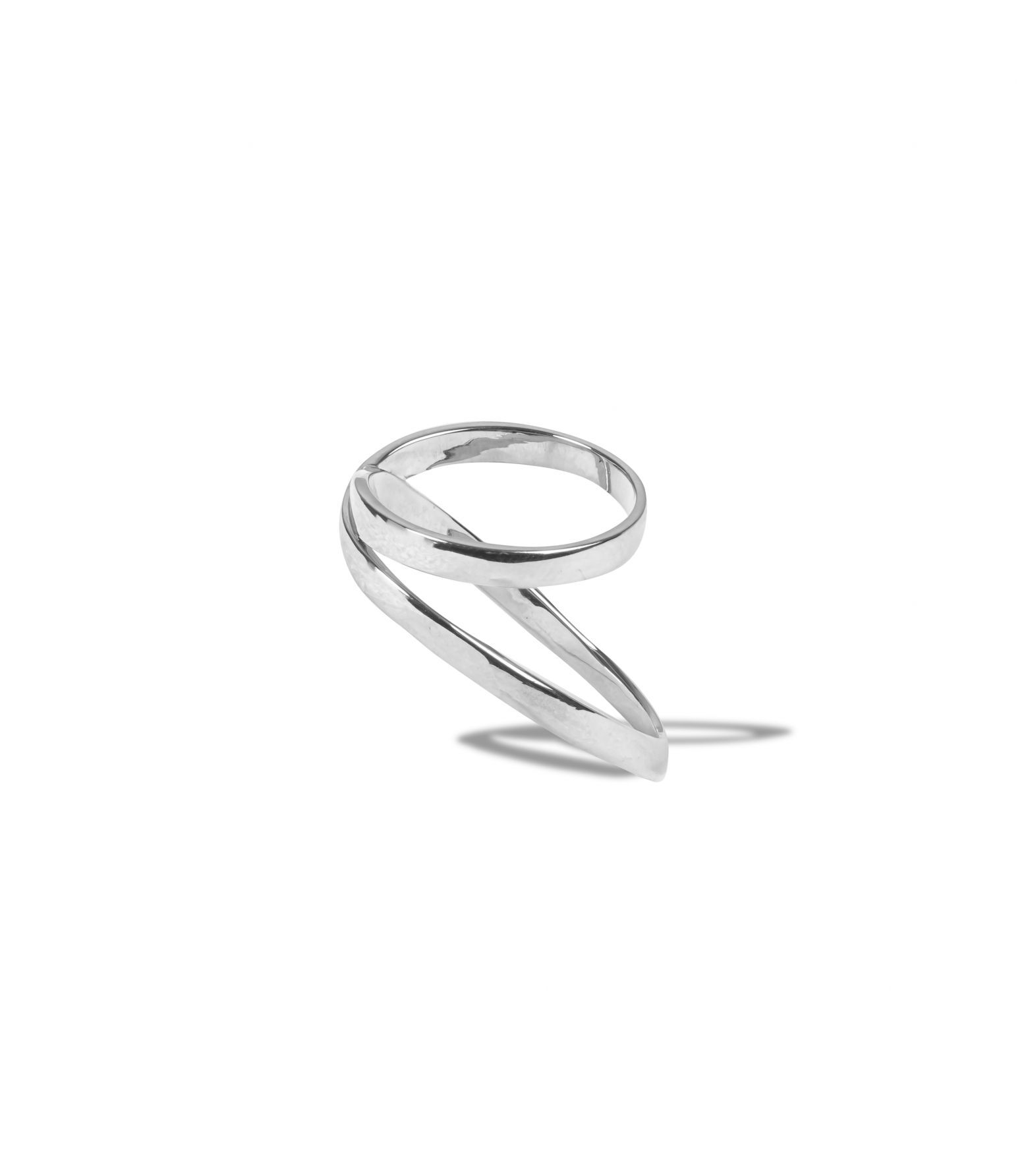 兩道方扁切面的純銀戒身彼此交會,線條俐落而清晰,結構感鮮明。