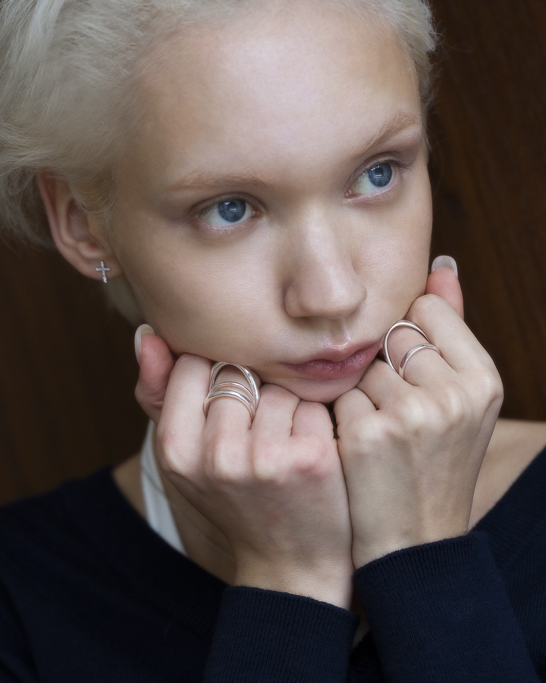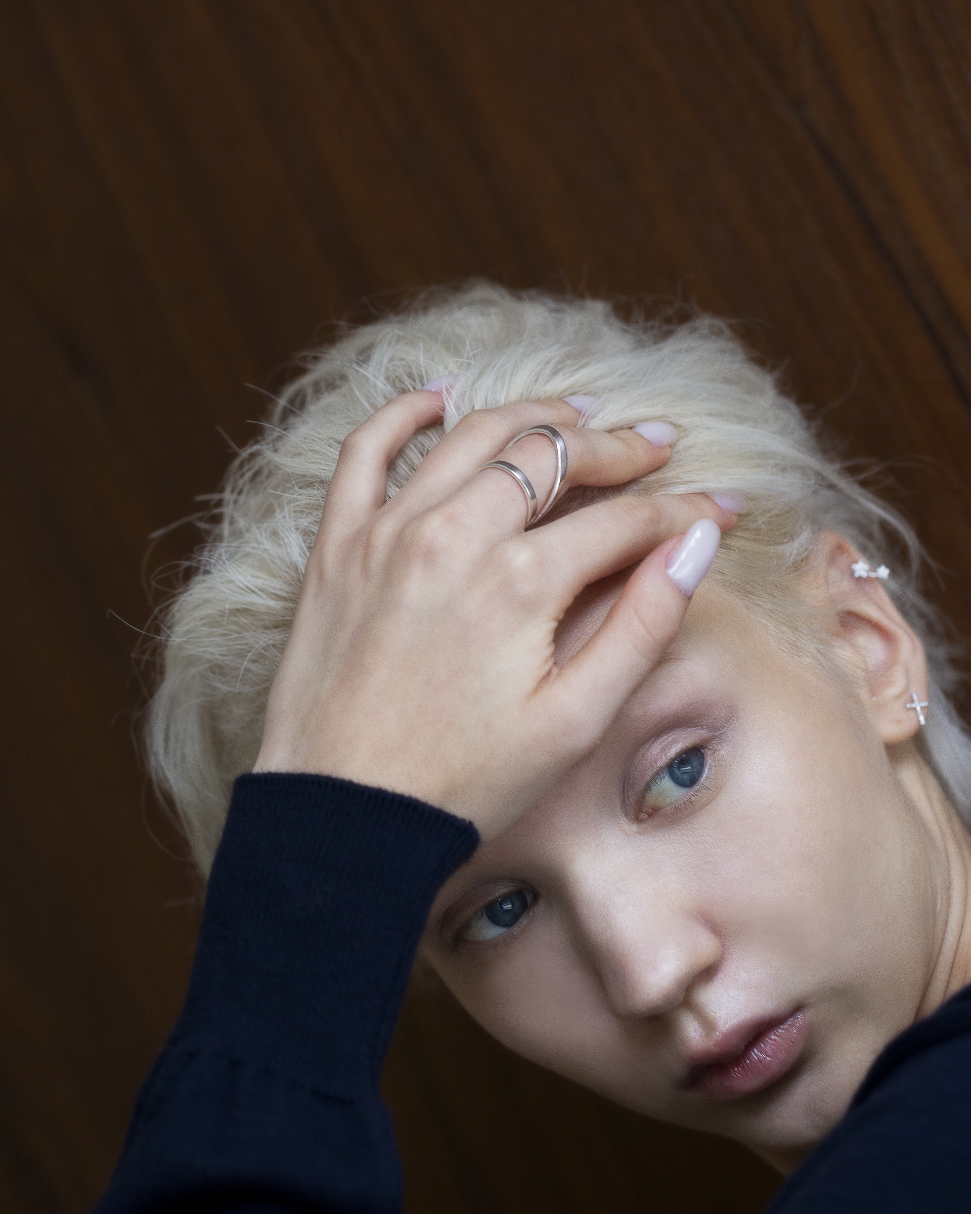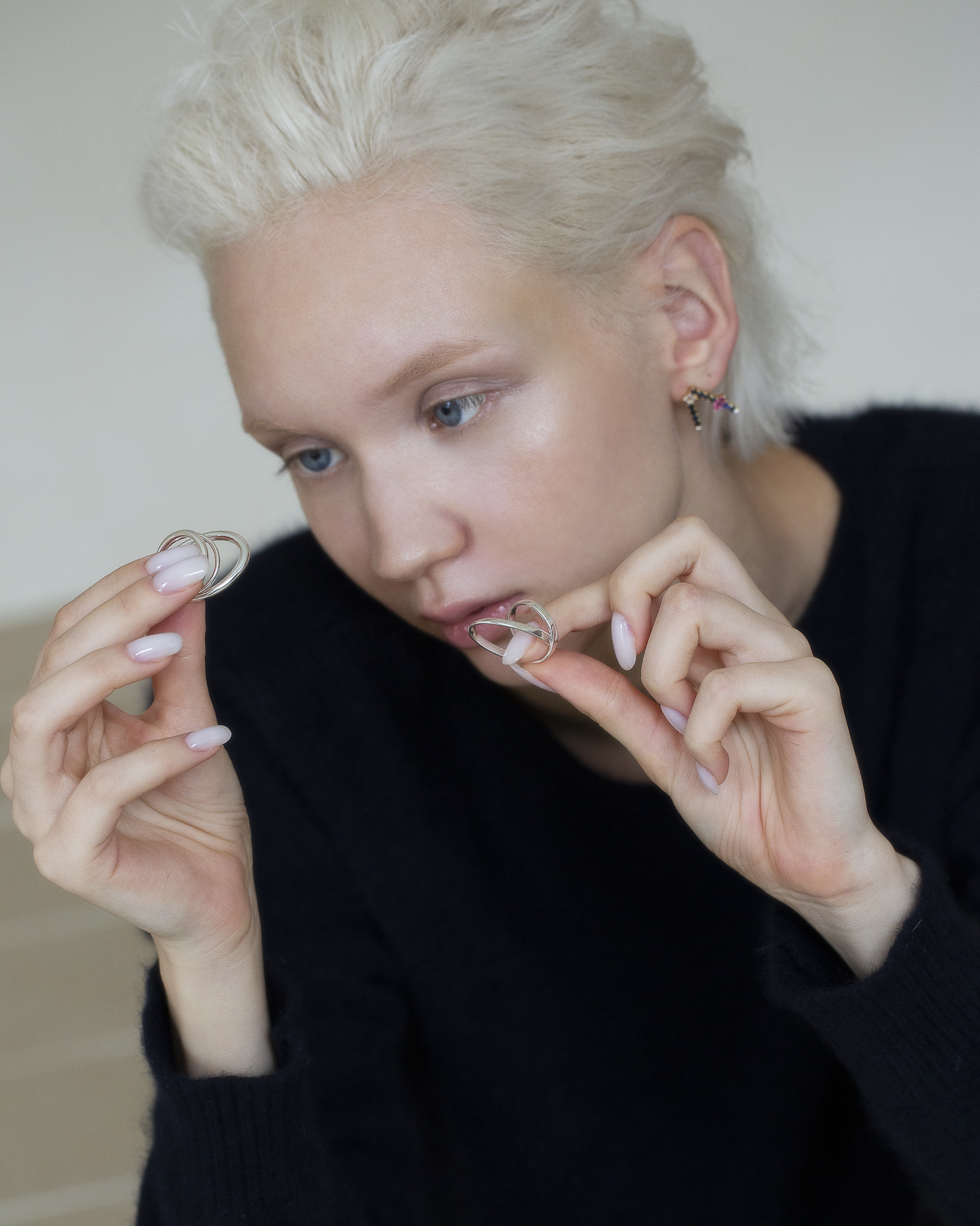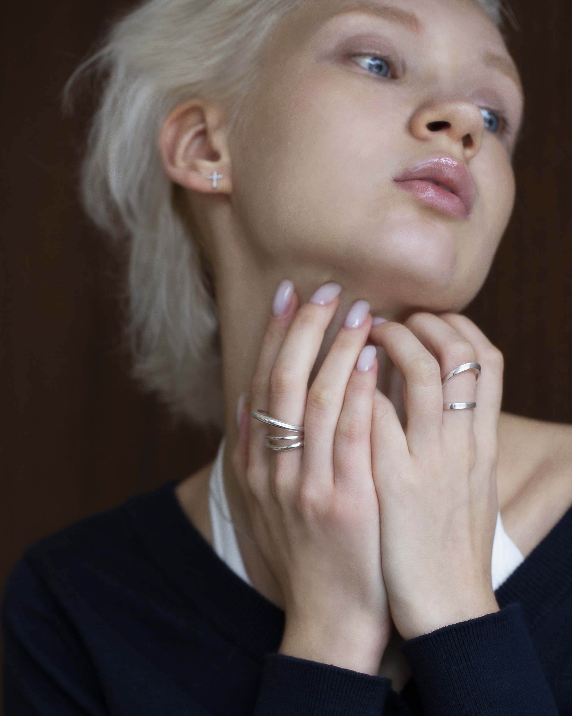 兩道方扁切面的純銀戒身彼此交會,線條俐落而清晰,結構感鮮明。